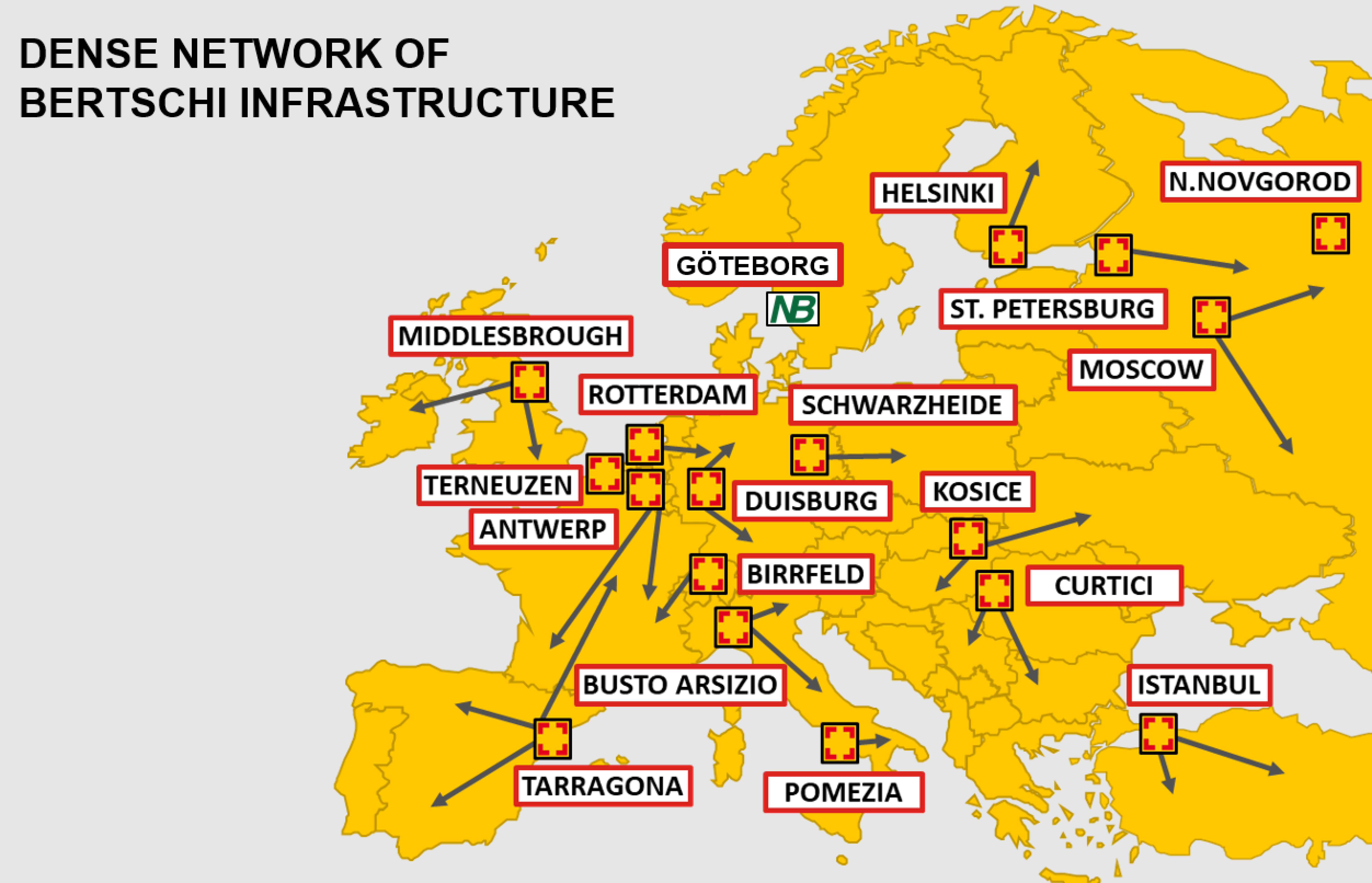 Die Bertschi-Terminals sind strategisch über ganz Europa verteilt. Sie bieten Lagermöglichkeiten für DG- und Non-DG-Produkte und decken damit ein breites Bedarfsspektrum ab. Darüber hinaus betreibt Bertschi Liquid Chemical Hubs für DG und Non-DG in Singapur und Zhangjiagang (China) sowie ein Lagerterminal in Jubail (Saudi-Arabien).